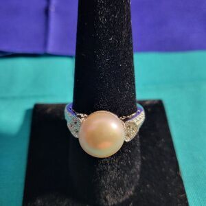 Introducing a true embodiment of sophistication and grace with this beautiful ring. The design of this ring has a large 11-12mm cultured freshwater button pearl, with .05 ctw white topaz accents in a sterling silver heart design. Measures approximately 7/16"L x 1/16"W.