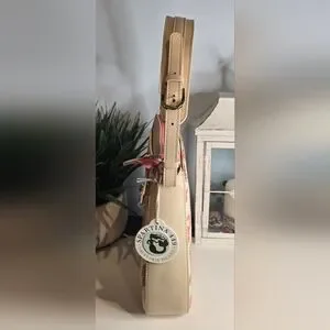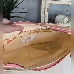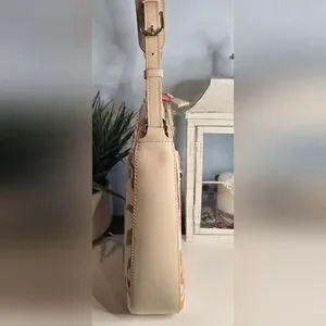 This floral handbag is the Spartina 449 Lena Shoulder Bag in the Richmond Hill Cream pattern. It features a cream-colored exterior with a pink and orange floral design, faux leather trim, and a top zipper closure. Top handle carry which is adjustable.