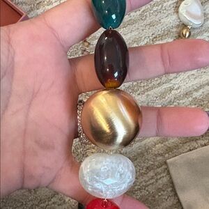 This stunning necklace features a blend of gold, red, green, and brown beads, perfect for adding a touch of elegance to any outfit.
