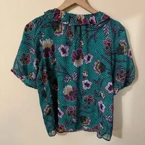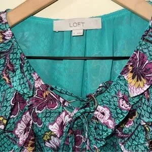 Loft Womens Blue Green Floral Short Sleeve Blouse Size Small Tie in front