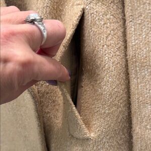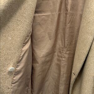 Elegant double-breasted oversized design. Warm tan color. Silky lined material. Functional pockets. All buttons are secure. Ideal for cool weather. Minor stiching pattern as shown in picture