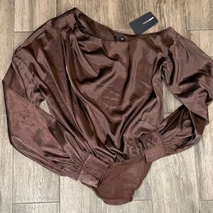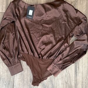 NWT Fashion Nova High Status Satin Brown Long Sleeve Bodysuit