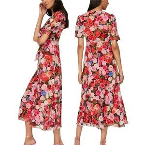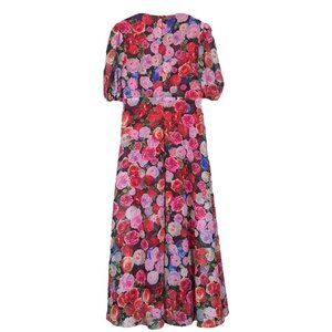 Ieena Mac Duggal Floral Puff Sleeve Tie Slit Romantic Midi Dress Pink Red Size 0