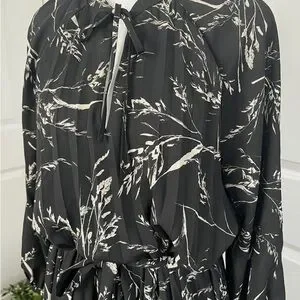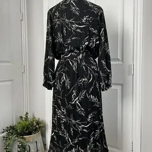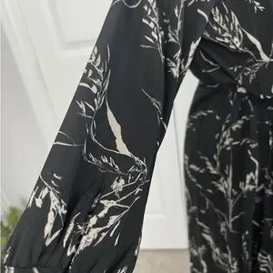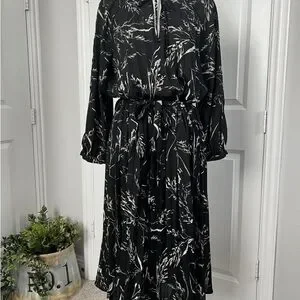 SOLD H&M Women’s Black White Floral Pleated 3/4 Sleeve Tie Waist Midi Dress