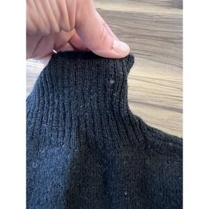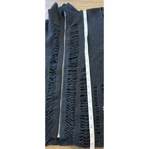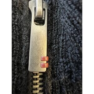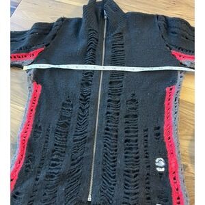 Pre-owned with intentional distressed knit design throughout. There is a small hole at the back collar/neckline (shown clearly in photos). Light natural pilling consistent with wool fabric and normal wear. Zipper functions properly. No repairs attempted.