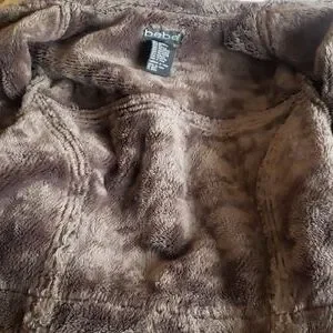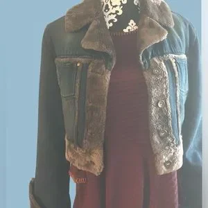 Bebe denim y2k boho cropped jacket with brown plush faux fur trim