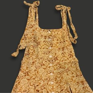 Elegant jumpsuit with floral pattern. Features tie straps and wide legs. Perfect for casual wear.