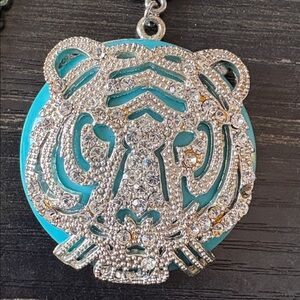 Elegant silver necklace featuring a striking blue tiger pendant. Perfect for adding a bold touch to any outfit.