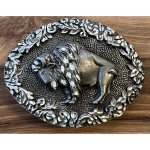 Vintage Western-style belt buckle featuring a raised ram / mountain goat motif with ornate floral scroll border and textured background. Oval shape with deep relief detailing and a solid, heavy feel.
