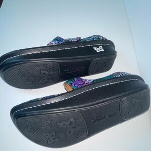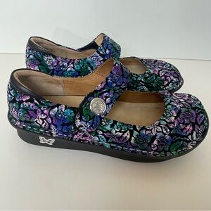 Alegria Paloma metallic hibiscus floral pattern. Blue purple and green. Step out in style with these vibrant floral Mary Jane shoes. Perfect for adding a pop of color to any outfit. Used in excellent like new condition