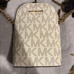 Stylish Michael Kors crossbody with beige and brown design. Features iconic MK pattern and elegant chain strap.