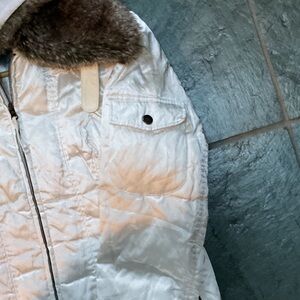 Elegant ivory puffer by Pajar. Features a luxurious faux fur collar. Perfect for warmth and style. Collar can be removed.