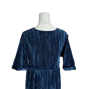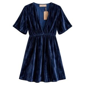 New with tags Natural Life velvet burnout dress in a rich navy blue with subtle tonal texture throughout. Designed with a flattering deep V neckline, relaxed empire waist, and easy short sleeves for a flowy, boho-inspired silhouette.