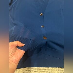 New with tags, size 3(XL), three button front, 3/4 sleeve length, imperial blue, 73% cotton 27% nylon. Semi sheer.Please see pictures for measurements. Tags: Classic, Timeless, Office, Formal, Holiday, New Years, Business Casual, Casual, City.