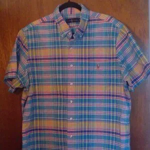 The product is a Polo Ralph Lauren Men's Plaid Button Down Shirt in size XL. It features a classic plaid pattern in multicolor, made of cotton with a woven fabric type. The shirt has short sleeves, a collared neckline with a button-down style, and is designed for casual occasions. This stylish and versatile shirt is machine washable, making it easy to care for and perfect for everyday wear.