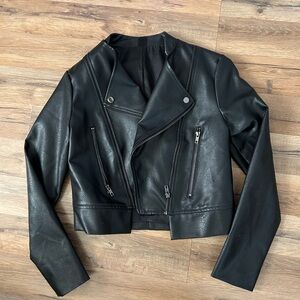 Chic black faux leather jacket with zipper details. Ideal for a modern look.