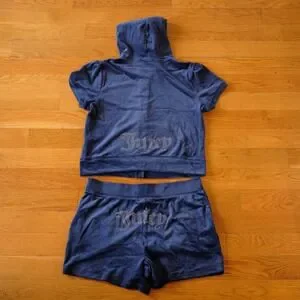 Keywords: Juicy Couture, Velour, Tracksuit, Y2K, McBling, Loungewear, Rhinestone, Co-ord Set, Navy Blue, Short Sleeve Hoodie, Velour Shorts, 2000s Aesthetic, Sleepwear, Athleisure