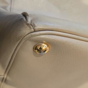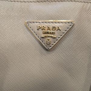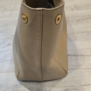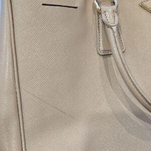 Chic Prada Safiano satchel in luxurious tan leather. Perfect for everyday elegance. Features sturdy rolled leather handles, gold toned hardware, and iconic logo. It is pre-owned and shows signs of normal wear and tear. The front has a 2" light pen mark shown in the photos. The back of the bag shows a small scratch mark as pictured. Also shows normal wear around the corners. Inside is very clean. Priced to sell! All offers welcome.