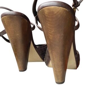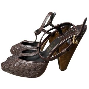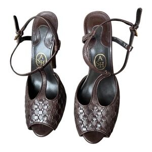 Ash Brown Leather Peep Toe Heels, Woven Details 40