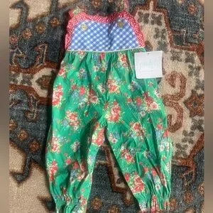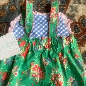 Brighten up your child's wardrobe with this charming floral one piece from Serendipity by Shrimp & Grits. Featuring a vibrant green base with colorful floral patterns, this outfit is perfect for playful days. The red polka dot accents and blue checkered design add a delightful touch.