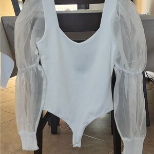Chic bodysuit with sheer organza sleeves. Perfect for stylish outings.