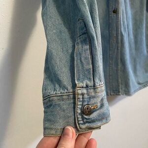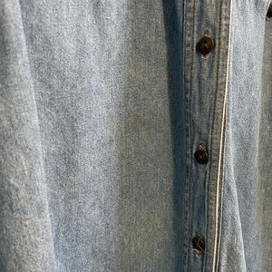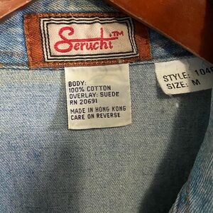 Unique retro blue jean shirt with black leather suede collar and metal buttons. Some signs of wear with light staining and missing bottom button—see photos.