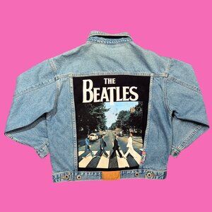 DESCRIPTION • The Beatles, Abbey Road Upcycled T-Shirt Denim Jacket Size M-L for Women CONDITION This jacket was made using a second-hand Beatles t-shirt. LABEL Label: Sun Valley, 100% cotton MEASUREMENTS Please carefully read and check the measurements. You may compare sizing with one of your own jackets. Lay in on the ground and measure laid flat. Size M-L for Women Approximate measurements, in inches, laid flat: Length: 22" Shoulders: 19'' Bust: 20'' Waist: 18'' Sleeves: 18.5''