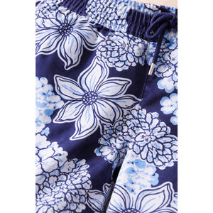 Adorable navy floral Lilly Pulitzer swim trunks in the “Low Tide Navy / Bouquet All Day” print. Lightweight, quick-dry fabric with comfy mesh lining and adjustable drawstring waist — perfect for beach days, pool vacations, or summer wear.