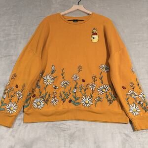 The Disney Our Universe Winnie the Pooh Wildflower BoxLunch Exclusive Size Large sweatshirt is a vibrant and playful piece perfect for any fan of the lovable character, Winnie the Pooh. With its yellow color, crew neck, and pullover style, this unisex sweatshirt is comfortable and stylish. The embroidered accents add a touch of charm, making it a unique addition to any wardrobe.
