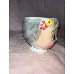 Nostalgic ceramic mug featuring a charming anthropomorphic face design with big blue eyes, rosy cheeks, and curled hair. A delightful collectible that brings whimsy to morning coffee or tea rituals.