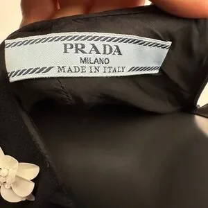 Elegant Prada Milano top in classic black chiffon fabric with striking white floral bead/sequin appliqué across the upper front. Polished "event-ready" piece that works for cocktail, dinner, or elevated day-to-night styling. Quick note: this style is also listed as "worn on TV".