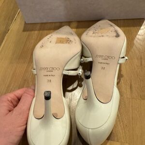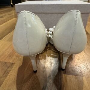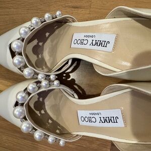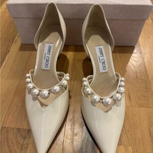 Jimmy Choo heels in cream. Features elegant pearl adornments. Perfect for stylish occasions.
