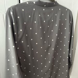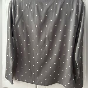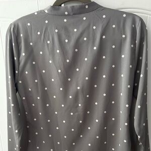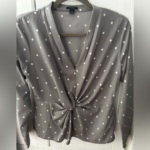 EUC Ann Taylor Charcoal Polka Dot Twist Blouse w/Long Sleeves V Neck LOVELY