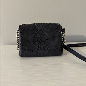 Chic GUESS crossbody with embossed design. Features chain and leather strap. Perfect for day or night.