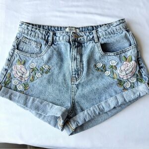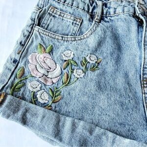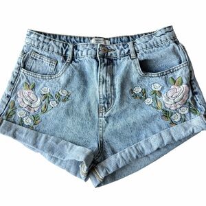 Stylish blue jean shorts featuring floral embroidery. Perfect for everyday wear.