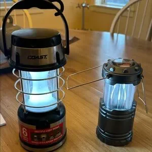 Set of two Coast LED lanterns. One emits a bright white light, the other a warm orange glow. Perfect for camping or emergencies.