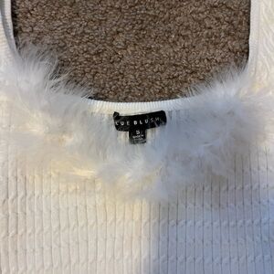 Blue blush white fur feather neck long sleeve top. Size S perfect condition worn once