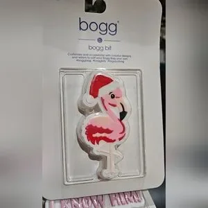 Festive flamingo accessory for BOGG BAG. Features a pink flamingo with a Santa hat. Perfect for holiday flair.
