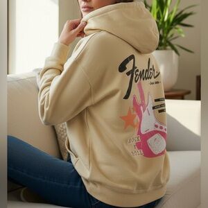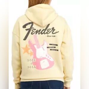 Rock a retro vibe with this officially licensed Fender graphic hoodie. Featuring a soft buttery yellow/beige color, it’s the perfect "boyfriend fit" piece for a relaxed, oversized look.