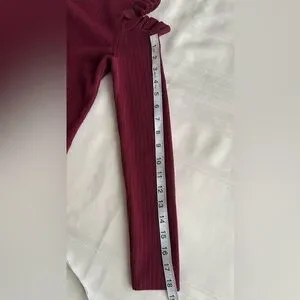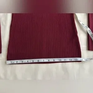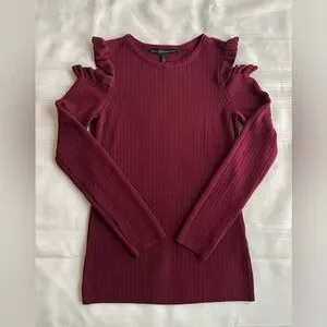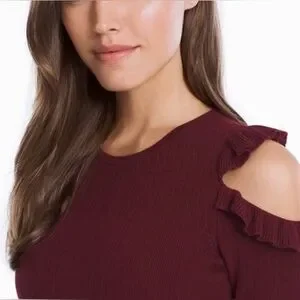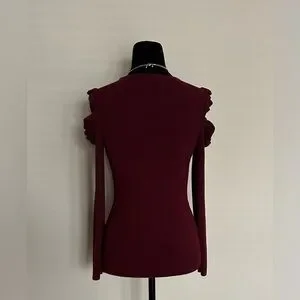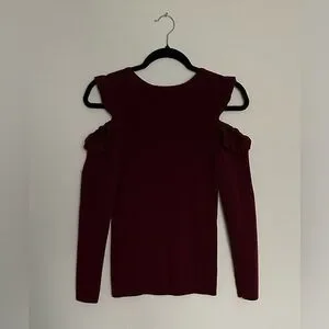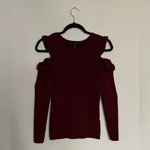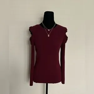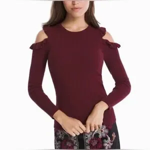 Elegant wine-colored sweater from White House Black Market. A fitted design with delicate ruffles at the shoulders and a keyhole detail adds a feminine and modern touch. Made from a soft, stretchy blend (82% rayon, 16% nylon, and 2% spandex) for comfort and a flattering silhouette. Perfect for pairing with jeans or skirts in any season.
