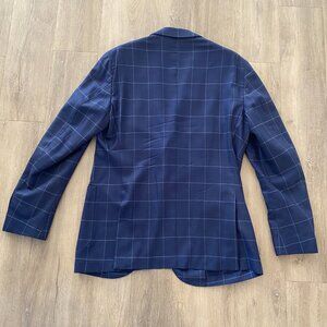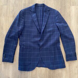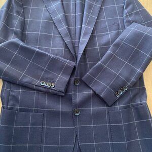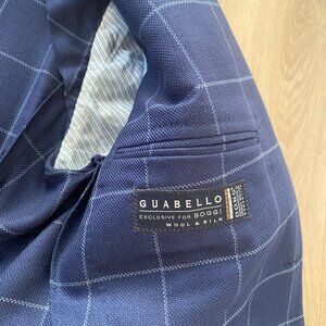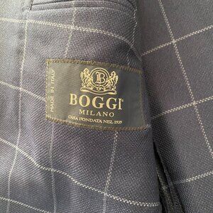 Elegant Boggi Milano sport coat crafted in Italy using premium Guabello wool and silk fabric. Classic navy base with subtle light blue windowpane pattern and refined textured weave. Lightweight tailored construction makes it ideal for year-round business casual or smart tailoring.