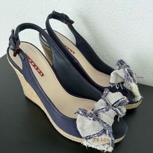 PRADA Navy Denim Bow Detail Logo Slingback Espadrille Wedge Sandals