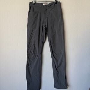 Fjällräven High Coast Lite Trousers in Stone Grey. Lightweight, technical performance pants designed for hiking, travel, and everyday active wear. Durable stretch fabric with articulated knees, utility pocketing, and a streamlined straight-leg fit that packs easily and dries quickly. Back pockets and zipped leg pocket. Size 27-28" Regular length. 14" waist; 9" rise; 32" inseam.