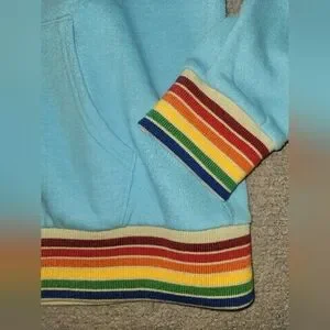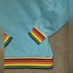 Stay stylish and comfortable with this blue hoodie featuring vibrant rainbow stripes. Perfect for casual outings.