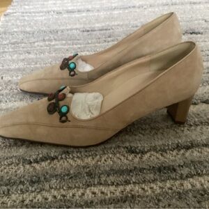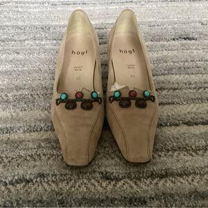 Elevate your wardrobe with these chic vintage beige heels from Hoegl. Adorned with unique embellishments, they combine style and comfort effortlessly. Ideal for any occasion.