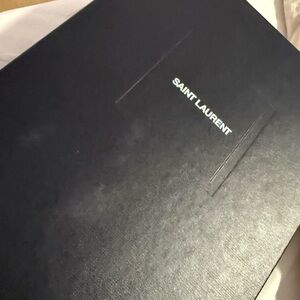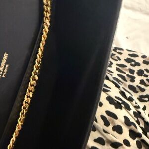 Chic black croc-embossed clutch. Features a striking gold chain. Iconic YSL logo detail.
