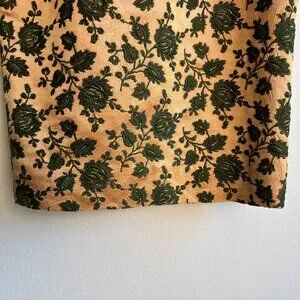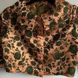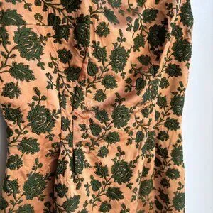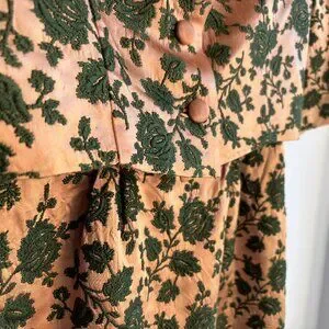 From my personal collection, rare handmade late 50s/early 60s two-piece: fitted pencil dress and coordinating cropped jacket. This tailored, Jackie Kennedy-like suit features rich bronze-golden base with moss green floral embroidered jacquard brocade. Très Prada vintage.
