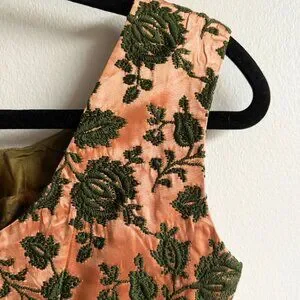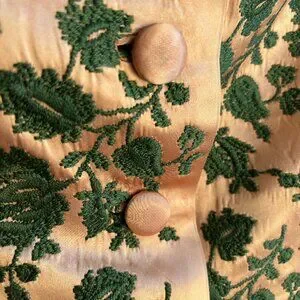 - Fabric: unknown, likely satin or silk for base fabric / Embroidered details: likely cotton & silk / Organza lining