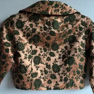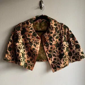 - Cropped bolero: 3/4 sleeves, wide round collar, large fabric-covered buttons, hits just above waist