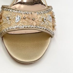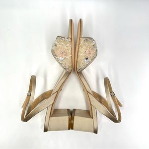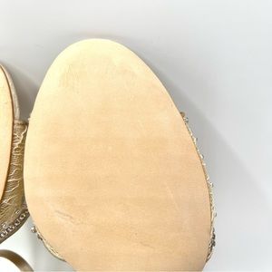 party special event evening dress up formal wedding bridal bride bridesmaid prom pageant satin shoes flats heels pumps strappy gold silver shimmery sparkly sparkle glitter glittery bling jewel jewels jeweled rhinestone rhinestones crystal crystals bhldn gems ankle strap open toe low block kitten stiletto heel metallic shiny pageant bhldn pearls embellished womens size 7.5
